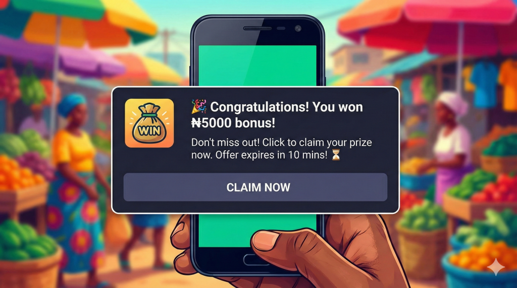 - Direct Gain / Freebies: Always a winner. “Claim your 5000₦ bonus” (Sweepstakes, Betting).