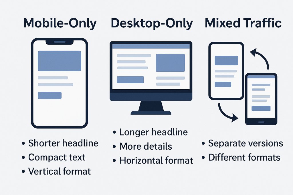Mixed traffic: separate creatives/campaigns per device, different visual formats, different copy lengths, bid adjustments.